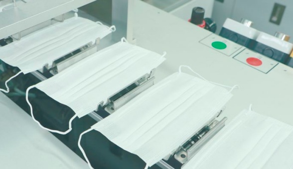 2.面層、濾層、底層三種面料自動對齊入料,雙邊對稱超聲連續壓邊,經連續滾輪壓邊切斷后,分流到兩個工位進行耳帶焊接以提高生產效率,焊完耳帶后自動計數碼堆。